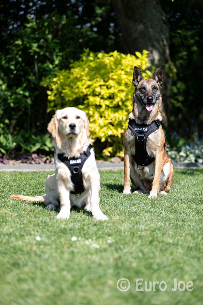 The Malinois “Keppe” wears a Large, the Golden Retriever puppy “Bee” (6 months), wears a Medium.
