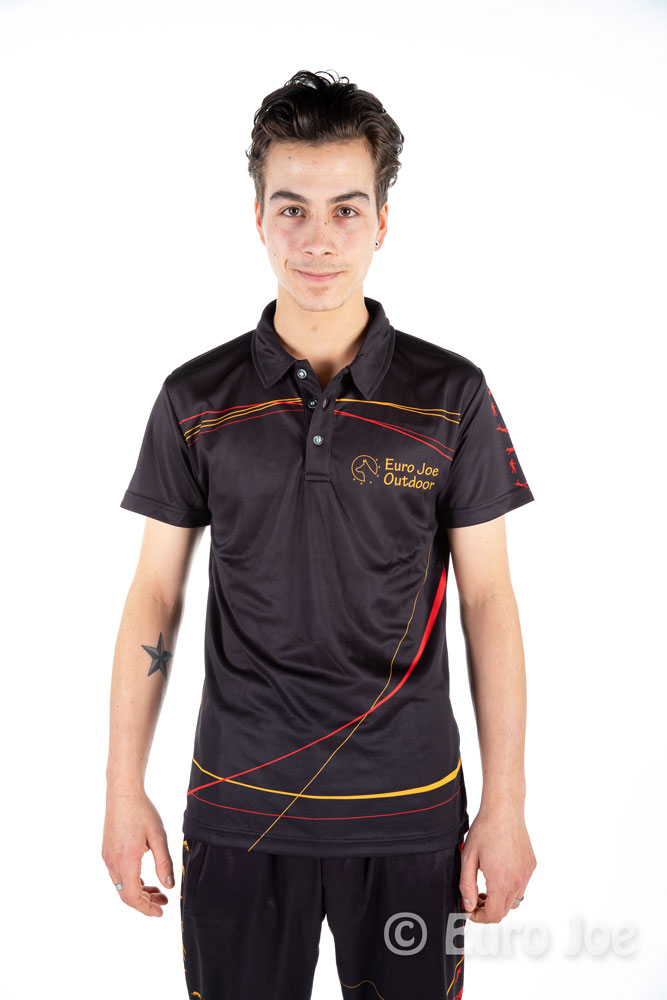 Polo in black basic color, with red and yellow lines and drawings.
