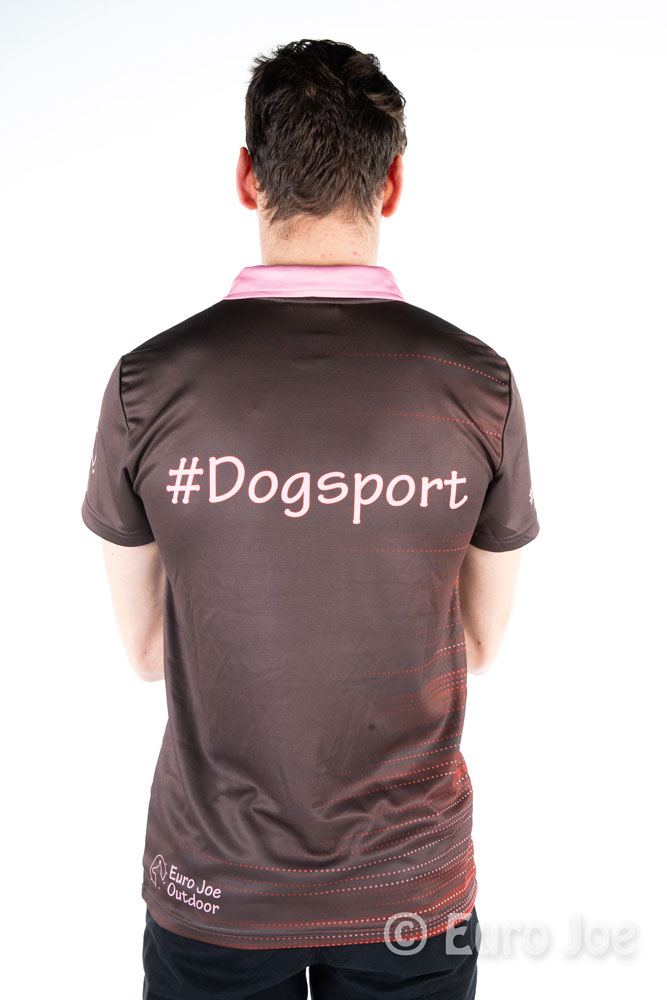 Brown polo with clear pink finish with print of dog sport images on the front.
