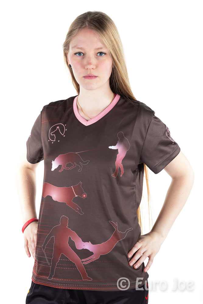 Brown T-shirt with dog sport print in light pink on the front.