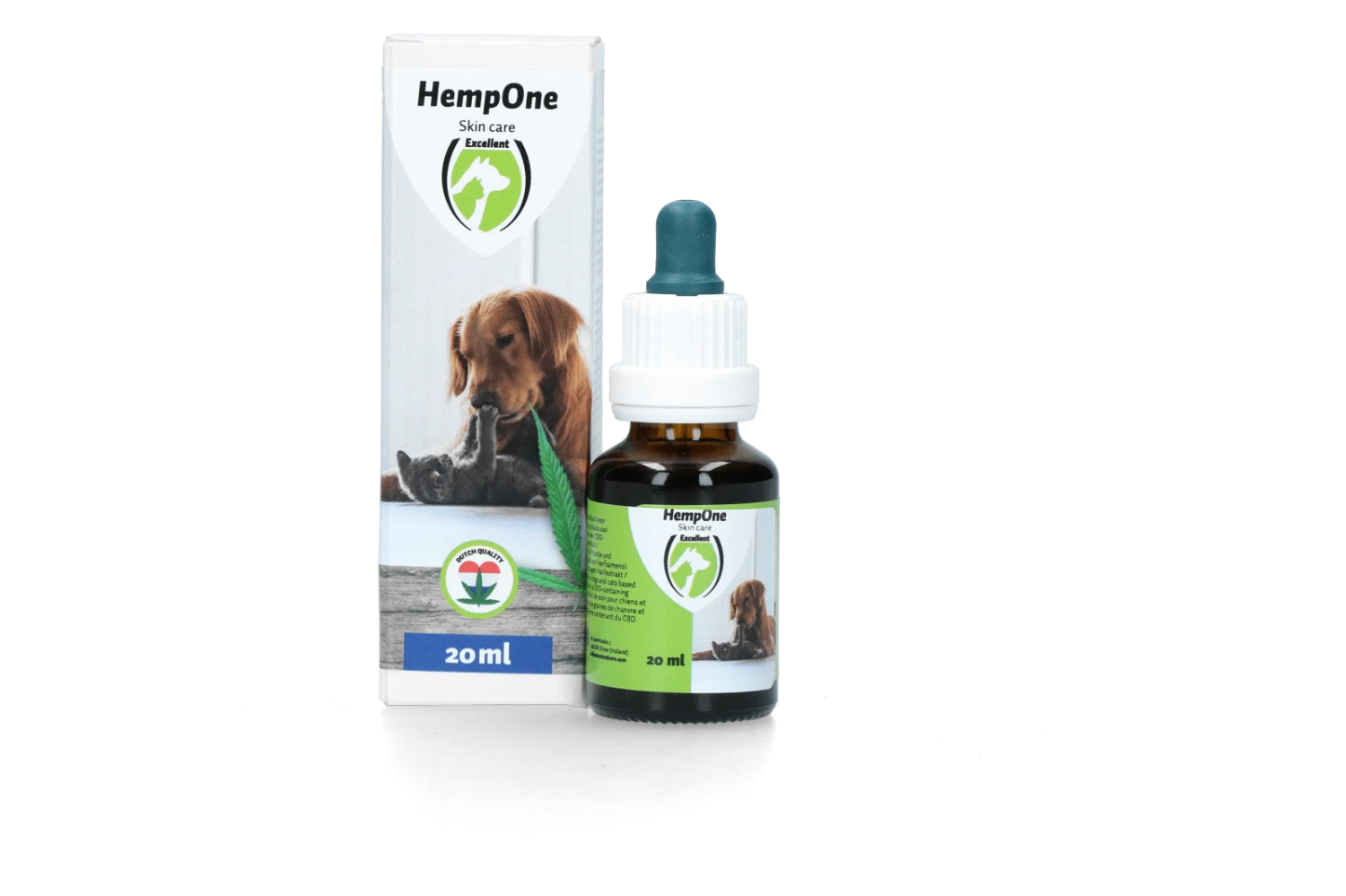 Huidverzorgingsproduct voor honden en katten op basis van hennepzaadolie en een hennepextract.