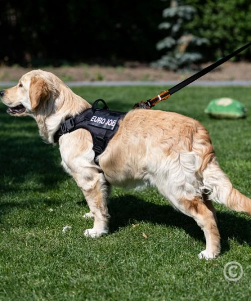 The Malinois “Keppe” wears a Large, the Golden Retriever puppy “Bee” (6 months), wears a Medium.