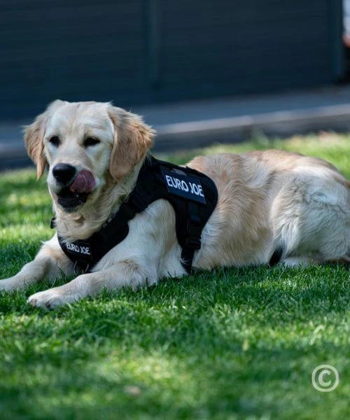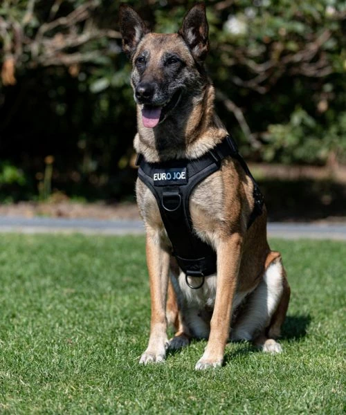 The Malinois “Keppe” wears a Large, the Golden Retriever puppy “Bee” (6 months), wears a Medium.