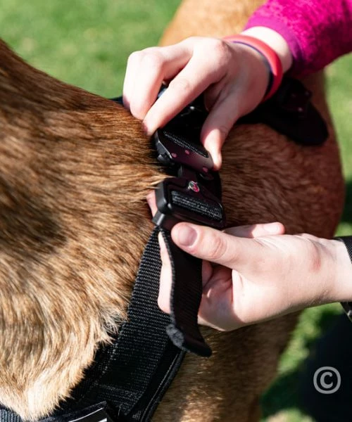There are several strips of Velcro on the harness, which gives you the opportunity to apply various name badges.