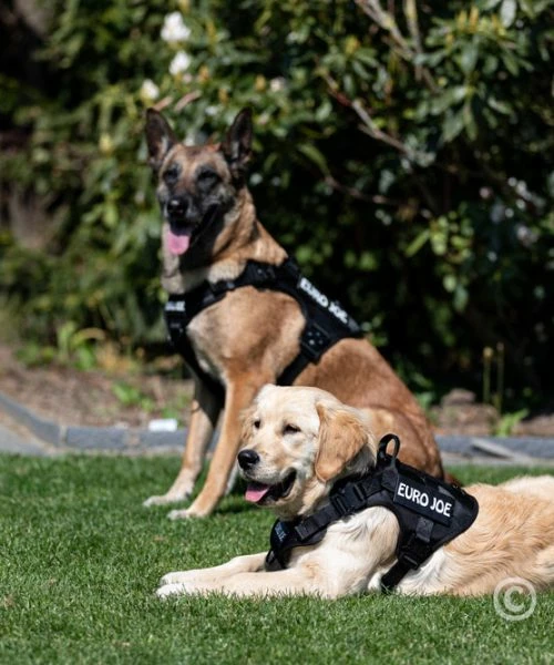 The Malinois “Keppe” wears a Large, the Golden Retriever puppy “Bee” (6 months), wears a Medium.