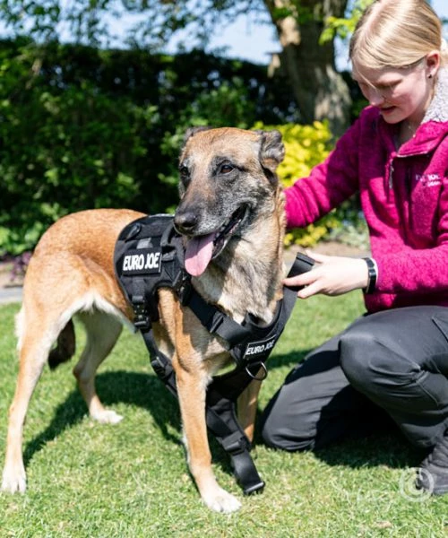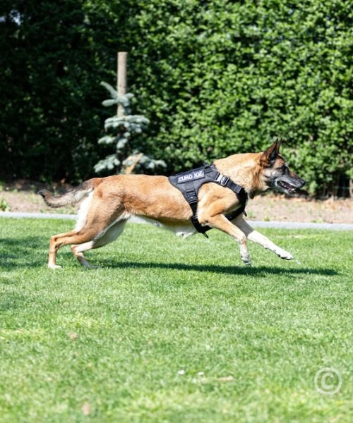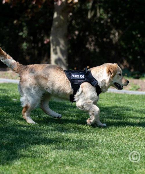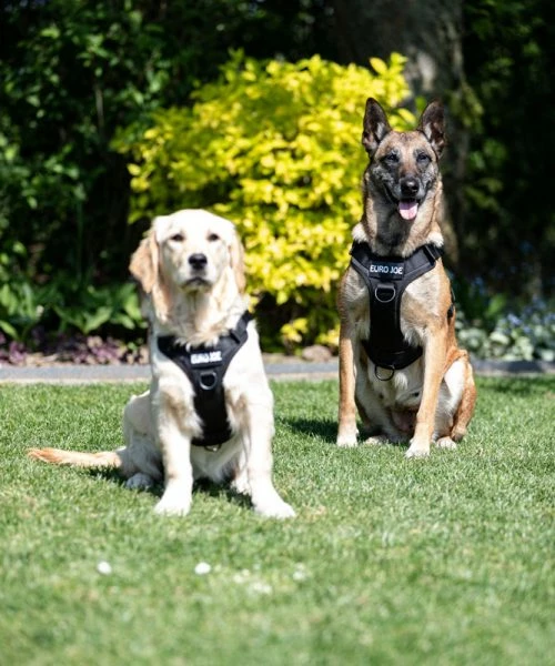 The Malinois “Keppe” wears a Large, the Golden Retriever puppy “Bee” (6 months), wears a Medium.