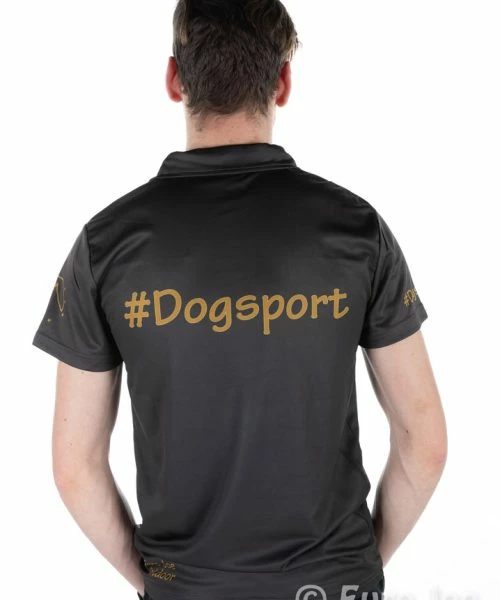 Polo in dark brown, almost black base color, has a golden print of bitework on the front.