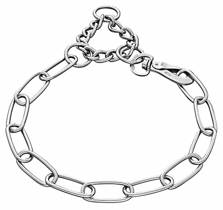 A very balanced and comfortable collar. The long links don’t damage the dog’s fur, and the smaller chain limits the maximum pull force.
