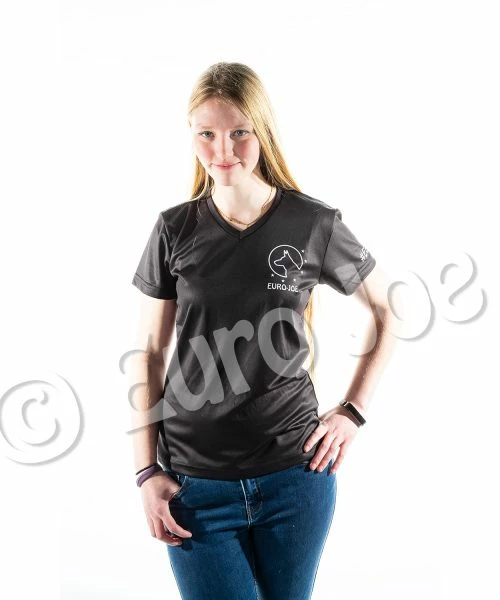 The T-shirt with collar has short sleeves. For ladies with V-neck, for men with round neck.
