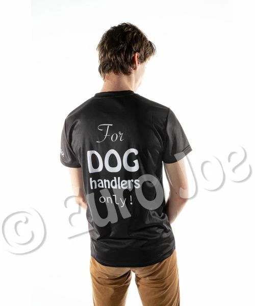 Black T-shirt with white print in the back “for Dog Handlers only”