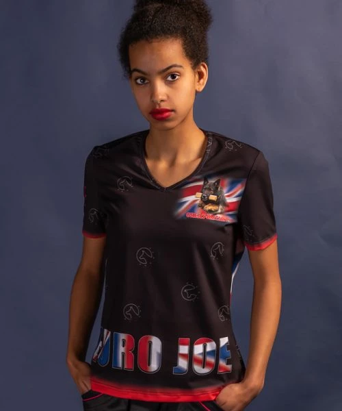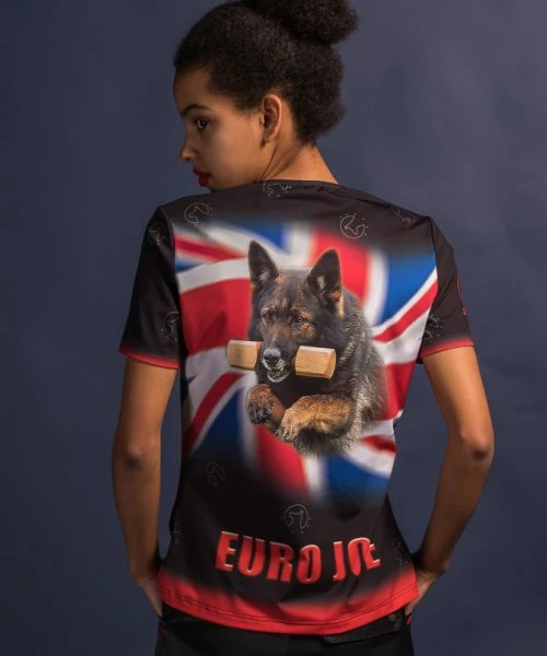 Comfortable t-shirt printed with the British flag and a German Shepherd with wooden dumbbell.